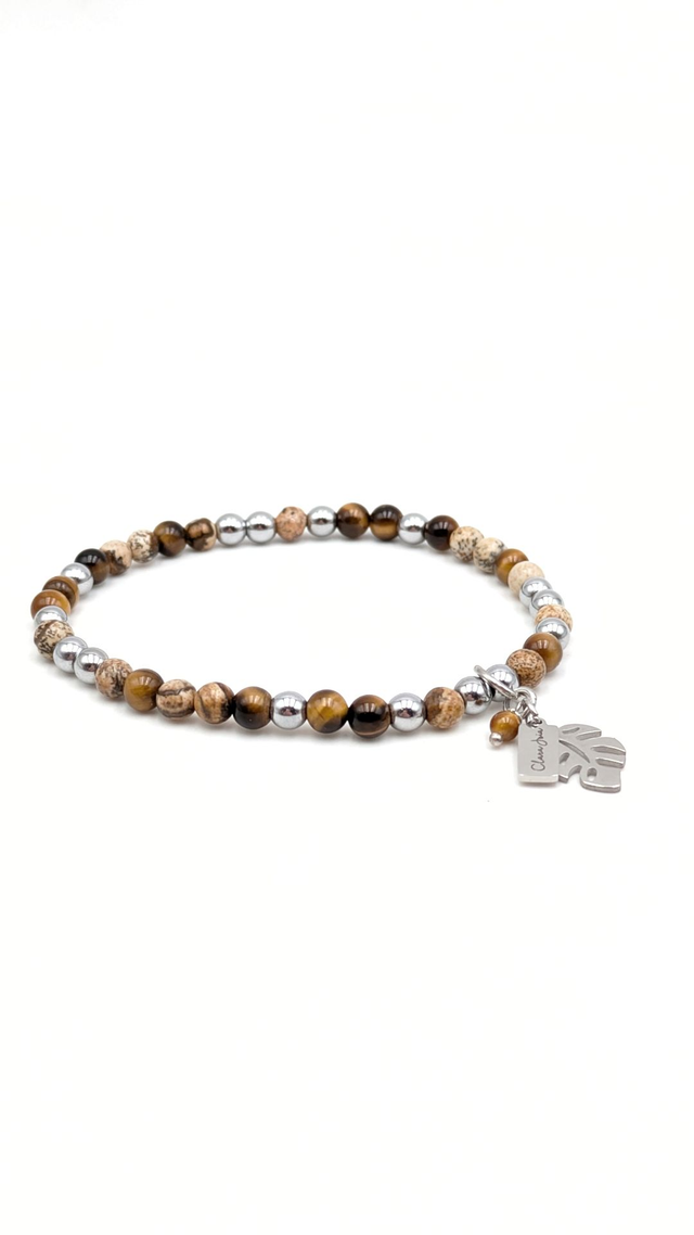 Bracelet Clara Joia Oeil de Tigre Jaspe Paysage Acier Argenté Monstera