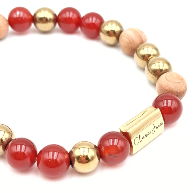 Ce bracelet chaleureux mêle la puissance de la cornaline à la douceur boisée du bois de senteur, sublimés par l’éclat de l’hématite dorée. Un bijou vibrant, symbole de vitalité, d’assurance et de rayonnement personnel. L’intercalaire doré signé Clara Joia ajoute une touche d’élégance unique.