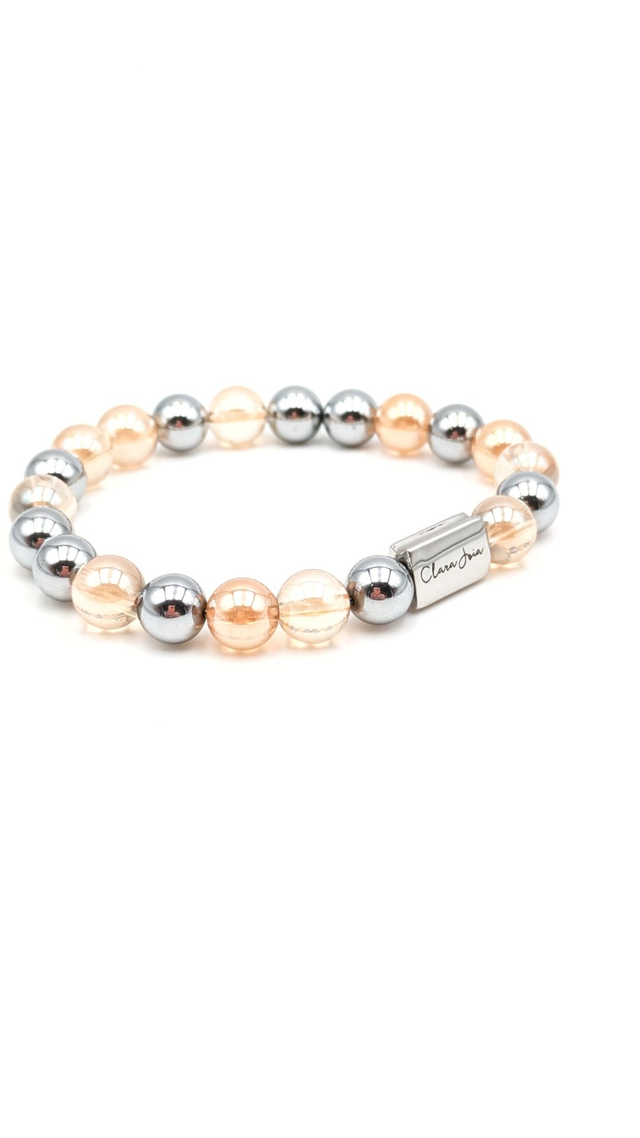 Un bracelet lumineux et puissant qui allie la douceur dorée du quartz aura sunset à la brillance de l’acier argenté. Il t'invite à rayonner, à retrouver la joie simple d’être soi et à te reconnecter à ta lumière intérieure. Un bijou à la fois élégant et énergétique.