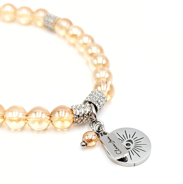 Ce bracelet élégant et lumineux associe la douceur dorée du quartz aura sunset à la symbolique protectrice de l’œil gravé. Une invitation à rayonner tout en se protégeant des influences extérieures. Les intercalaires en acier texturé apportent une touche de sophistication tout en restant discrets et raffinés.