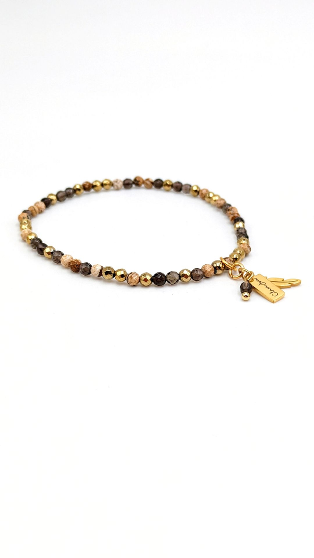 Ce bracelet fin en pierres facettées de 3 mm allie la profondeur du quartz fumé à la douceur terreuse du jaspe paysage. Il favorise l’ancrage, la sérénité et la clarté intérieure. Les perles facettées captent la lumière et ajoutent une touche scintillante à ce bijou doré à la breloque plume, symbole de légèreté et d’intuition.