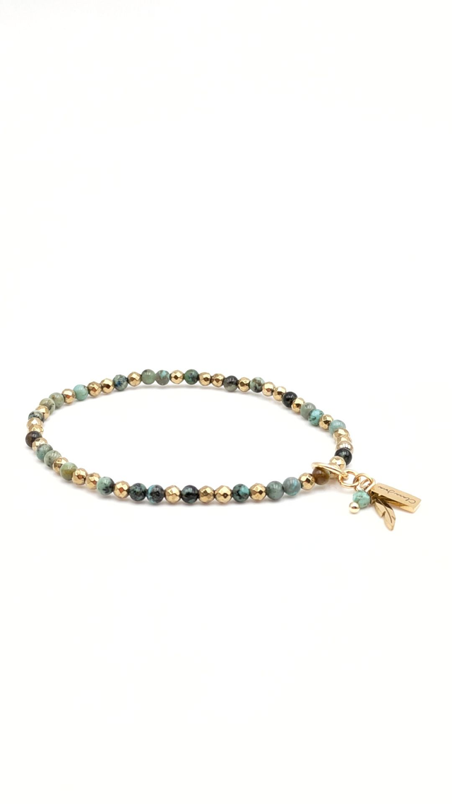 Ce bracelet tout en finesse associe des perles facettées de turquoise africaine et d’hématite dorée de 3 mm. Chaque perle révèle une palette de verts profonds, de bruns et de beiges mouchetés, créant un bijou à l’élégance sauvage et lumineuse. Les breloques dorées et la pampille Clara Joia ajoutent une touche délicate et vibrante.