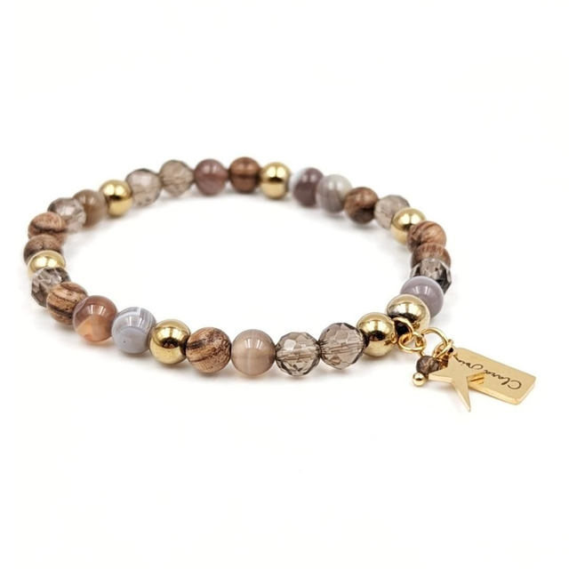 Ce bracelet associe des perles de bois d'encens, d'agate naturelle, de quartz fumé facetté pour une harmonie subtile entre matière brute et raffinement doré. Chaque pierre est choisie pour ses nuances douces et chaleureuses, allant du brun boisé au gris fumé, en passant par des reflets dorés.